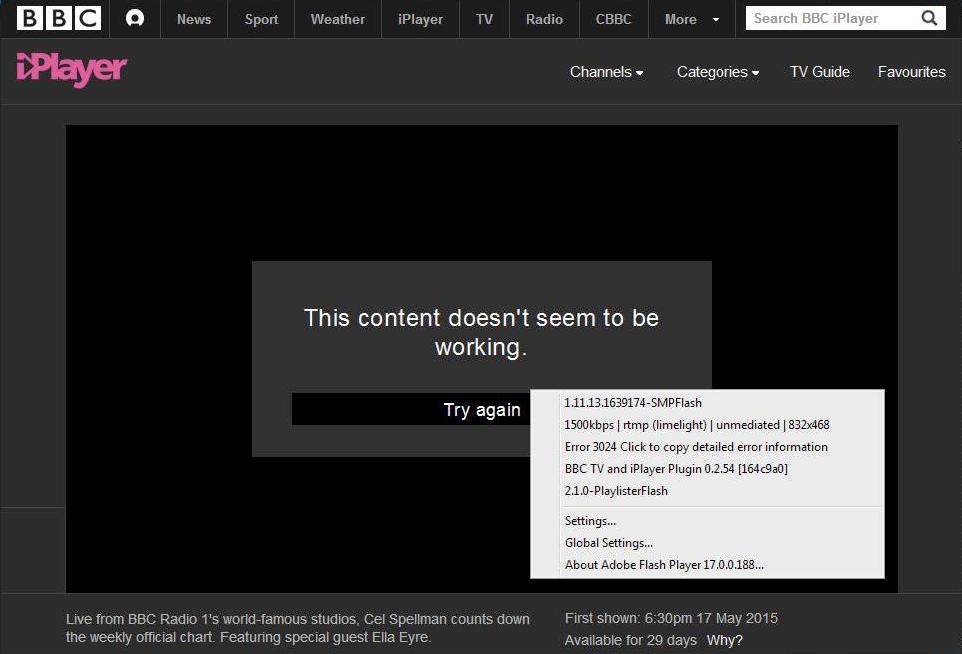 rtmpdump -r "rtmp://bbcfmt.fcod.llnwd.net:443/a8984/e3" -a "a8984/e3?as=adobe-hmac-sha256&av=1&te=connect&mp=iplayerstream/secure_auth/1500kbps/modav/p02qwwtc_b05wdnqk_1431888493764.mp4,iplayerstream/secure_auth/480kbps/modav/p02qwwtc_b05wdnqk_1431888495161.mp4,iplayerstream/secure_auth/800kbps/modav/p02qwwtc_b05wdnqk_1431888493280.mp4&et=1432087491&fmta-token=03820e4e2b1cb1084f83ece19547f88a23aa1af6bd35c5ec1c27f47970c7f7df" -f "WIN 17,0,0,188" -W "http://emp.bbci.co.uk/emp/SMPf/1.11.13/StandardMediaPlayerChromelessFlash.swf" -p "http://www.bbc.co.uk" -C O:1 -C O:0 -y "mp4:iplayerstream/secure_auth/1500kbps/modav/p02qwwtc_b05wdnqk_1431888493764.mp4" -o "b05wdnqk_1431888493764.flv"The above command (with valid token) DOES NOT WORK from a non-UK IP: