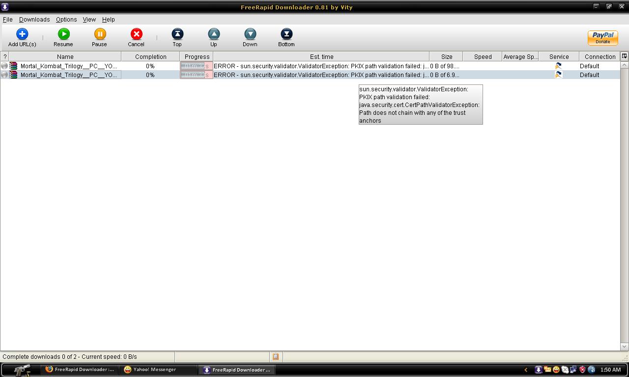 SEVERE: cz.vity.freerapid.core.tasks.DownloadTask@1c20eb7 failed: javax.net.ssl.SSLHandshakeException: sun.security.validator.ValidatorException: PKIX path validation failed: java.security.cert.CertPathValidatorException: Path does not chain with any of the trust anchors