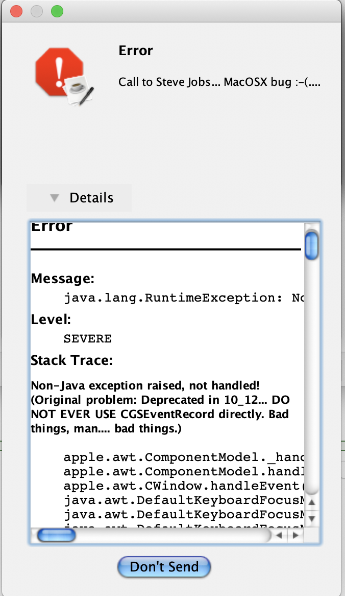 java.lang.RuntimeException: Non-Java exception raised, not handled! (Original problem: Deprecated in 10_12... DO NOT EVER USE CGSEventRecord directly. Bad things, man.... bad things.)